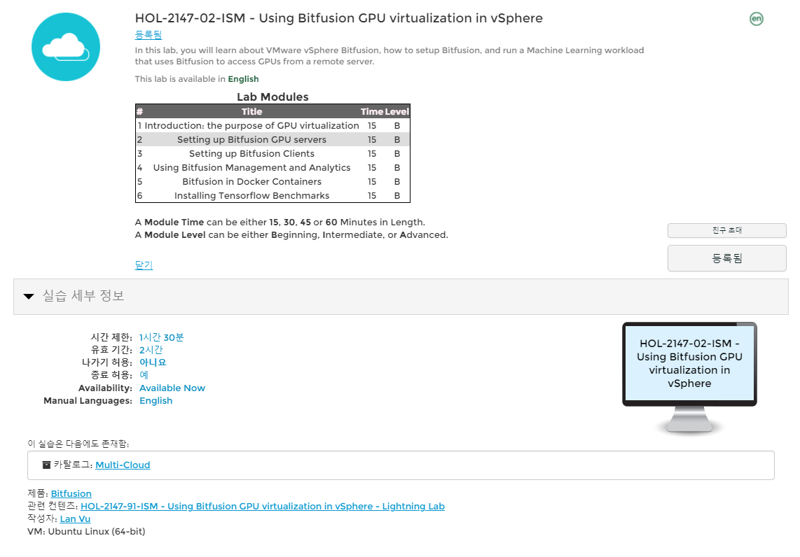 VMware Hands-on Lab에 vSphere 환경에서 BitFusion 구성에 대한 대한 HOL의 세부 링크를 모아봅니다.