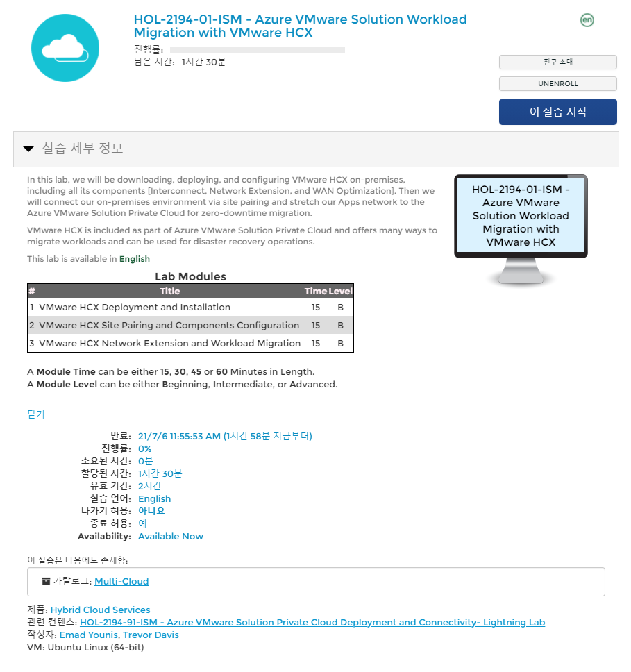 두번째 HOL(HOL-2194-01-ISM)은 Azure VMware Solution으로 HCX를 이용한 워크로드 마이그레이션입니다.