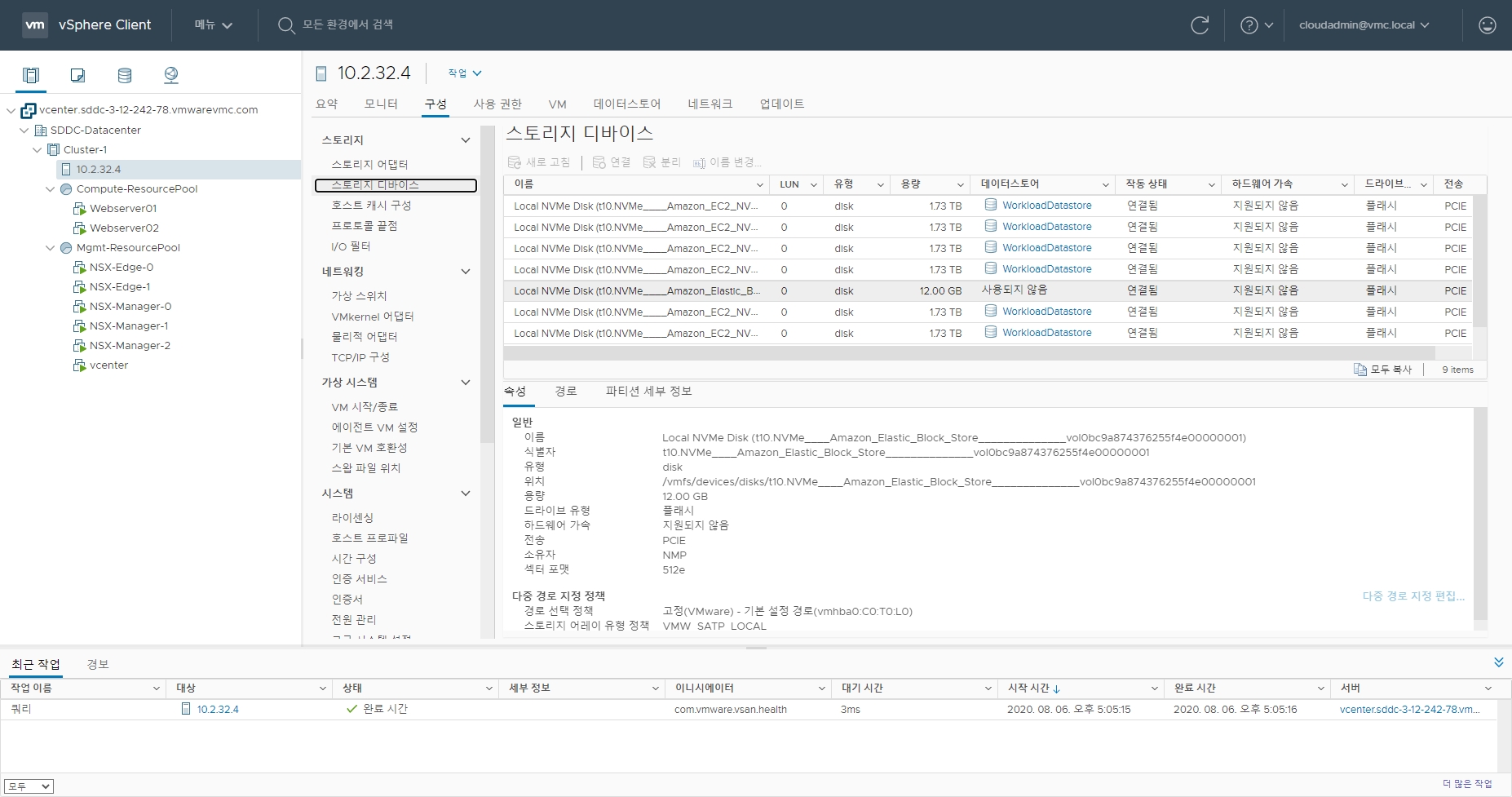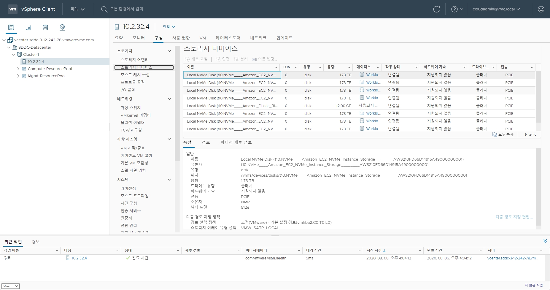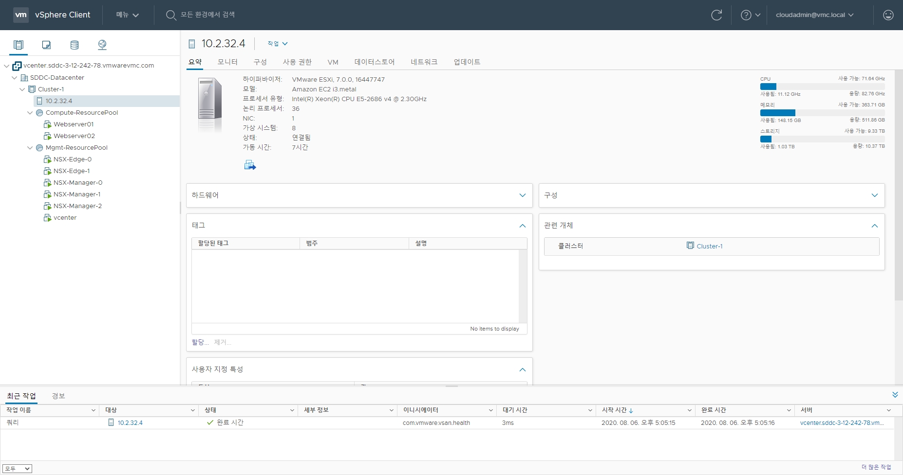 그럼, i3.metal 1대로 구성된 SDDC에서 vSphere Client를 통해서 세부 구성 정보를 확인해 보겠습니다.