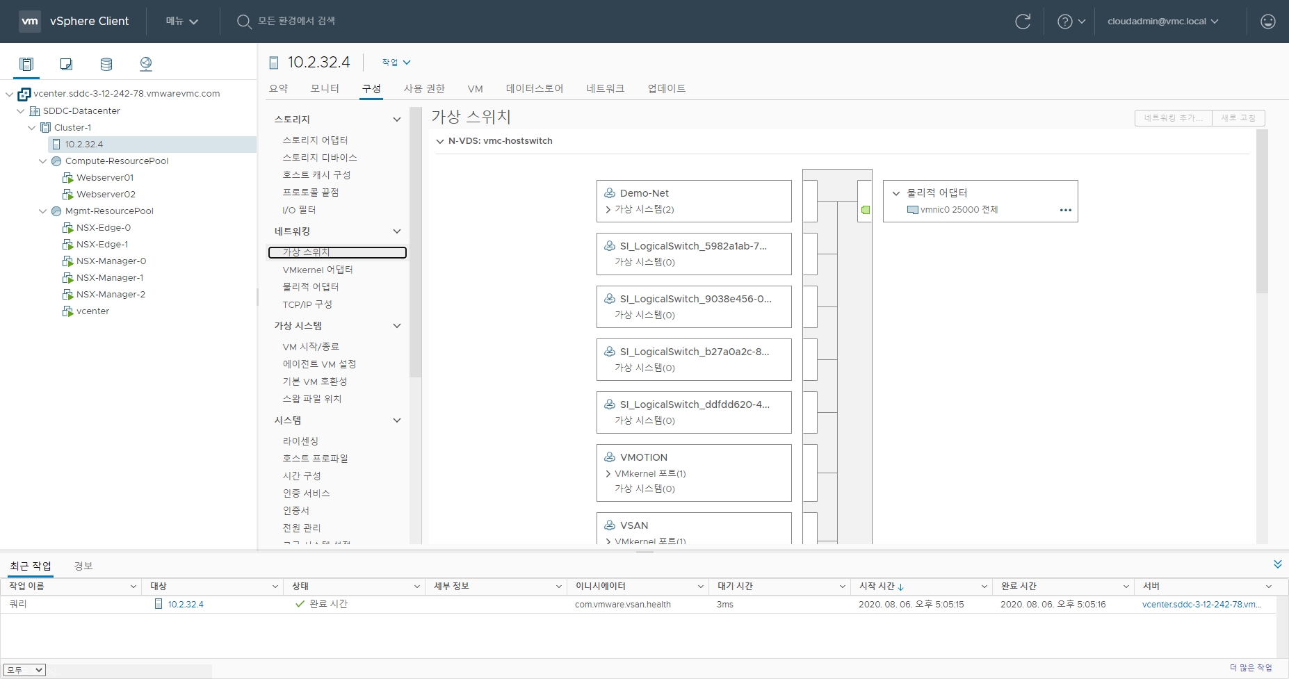 N-VDS 기반의 하나의 가상스위치(vmc-hostswitch)를 보유하고 있으며, 25G NIC 포트에 연결되어 있습니다.