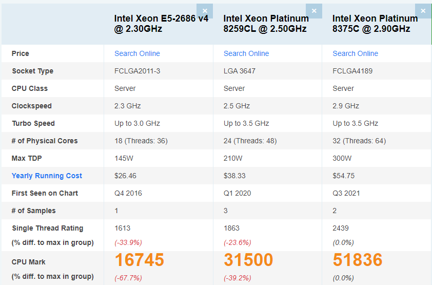 | CPU Model | Xeon E5-2686 v4 | Xeon Platinum 8259CL | Xeon Platinum 8375C |
