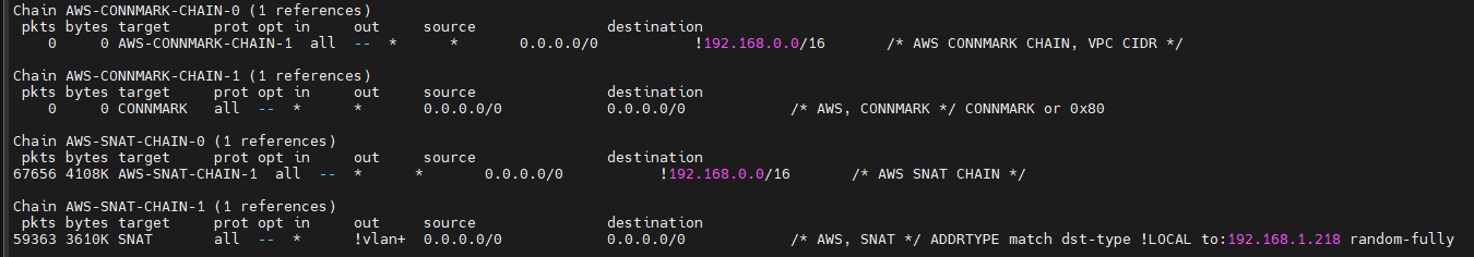 필요시 SNAT는 제거할 수 있으며, node 내 IPtables내 위치한 AWS-SANT-CHAIN을 활용합니다.