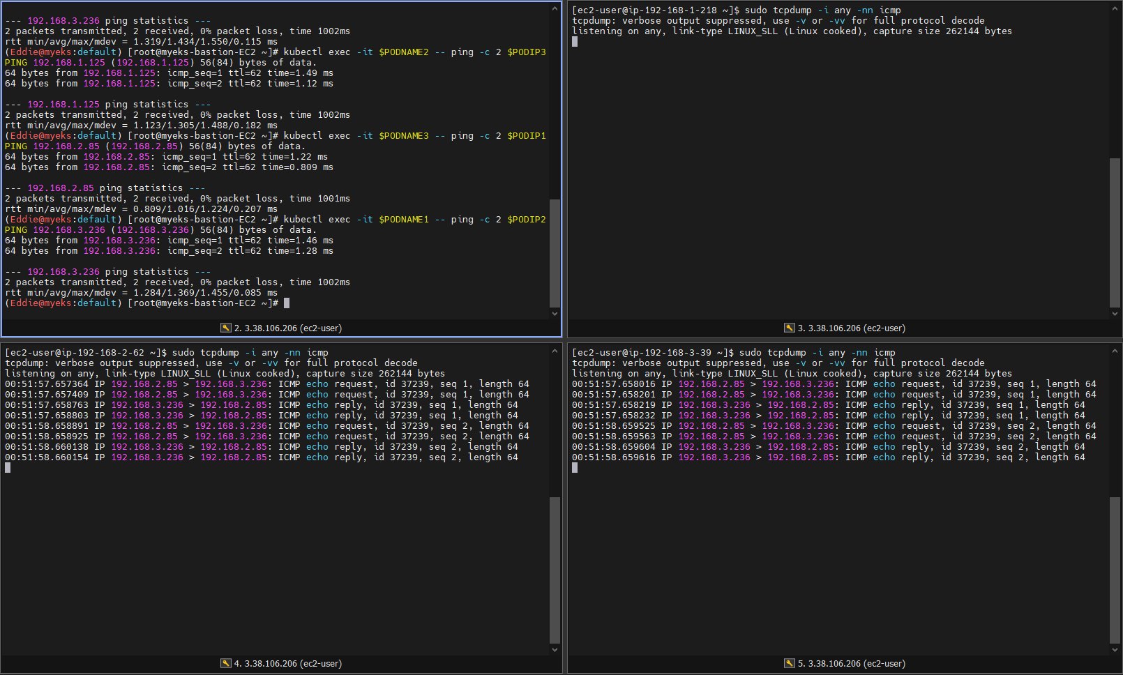 - pod 간 ping을 수행시 ENI를 통해 pod의 IP를 가지고 패킷이 직접 통신됨을 확인