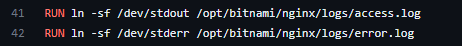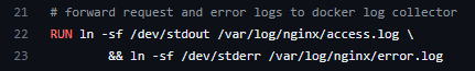 nginx 컨테이너 내부에 있는 access.log는 /dev/stdout으로 error.log는 /dev/stderr 경로를 통해 심볼릭링크가 걸려있습니다.