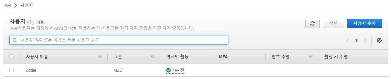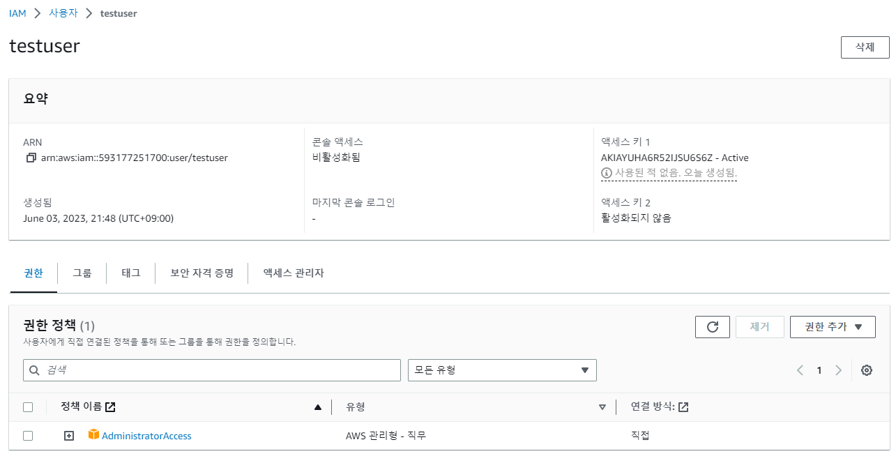- 신규사용자용 IAM 사용자 및 Access Key 생성 : testuser