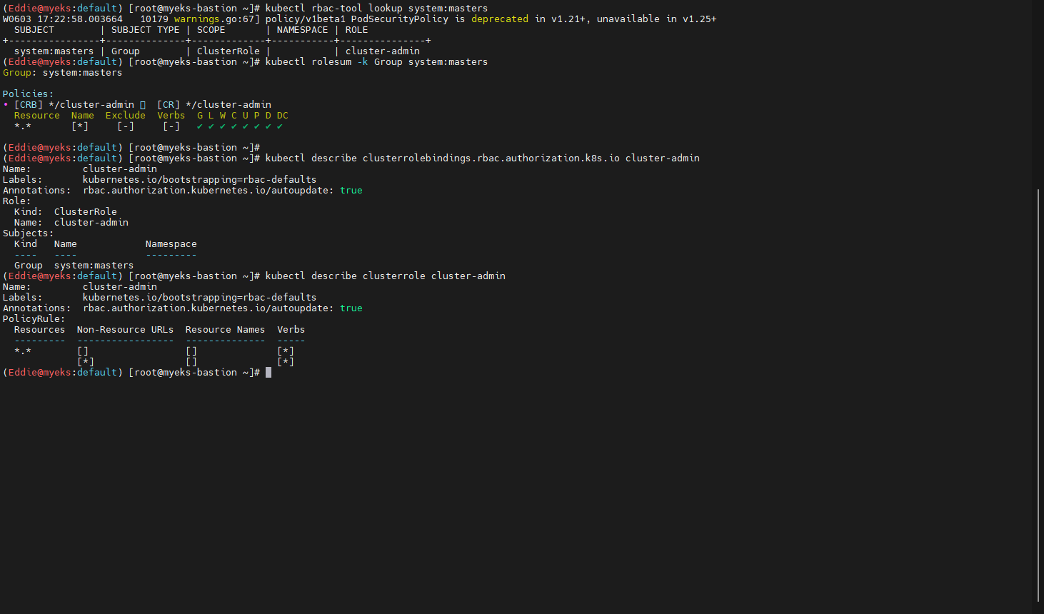: whoami 에서 확인되는 system:masters 그룹에 대한 정보가 없음 -> 보안상의 목적으로 숨김 처리(삭제 방지)