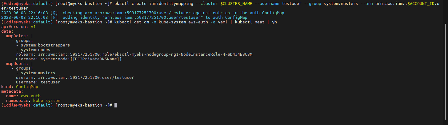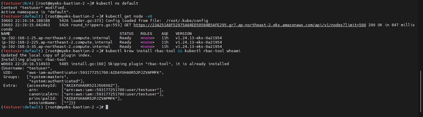 : testuser 에 system:master 그룹 부여 및 정상 매핑 여부 확인