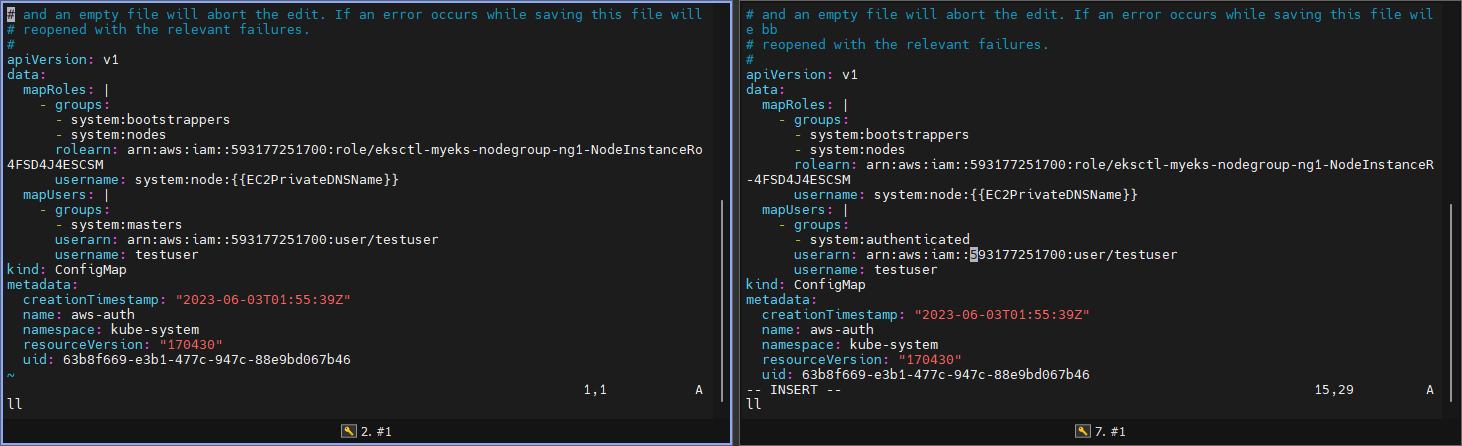 : kubectl edit cm -n kube-system aws-auth //master -> authenticated