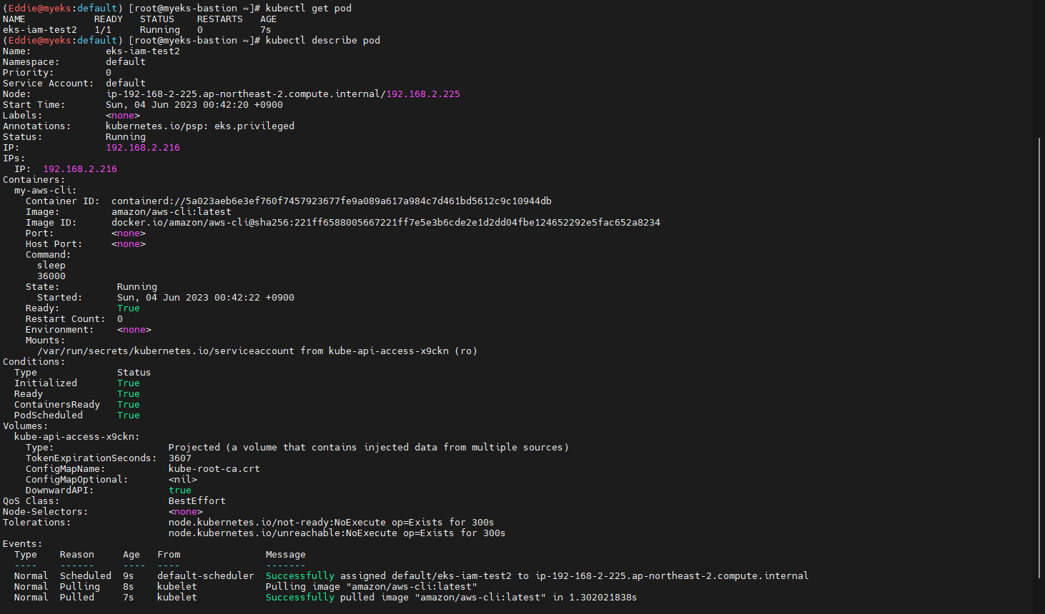 - 생성된 ServiceAccount를 사용하는 신규 pod를 배포