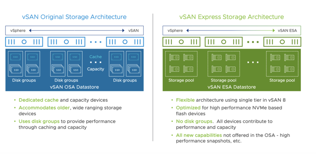 작년 VMware Explorer 2022에서 vSAN의 새로운 아키텍처인 ESA(Express Storage Architecture)가 발표되었습니다.