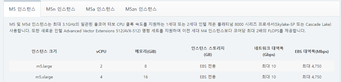 M5.xlarge의 경우 인텔 제온 플래티넘 8000시리즈 4 Core와 메모리 16G를 기반으로 하는 인스턴스입니다.