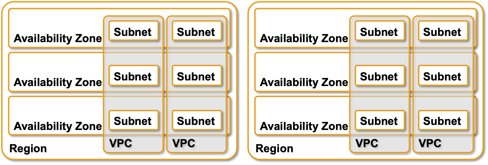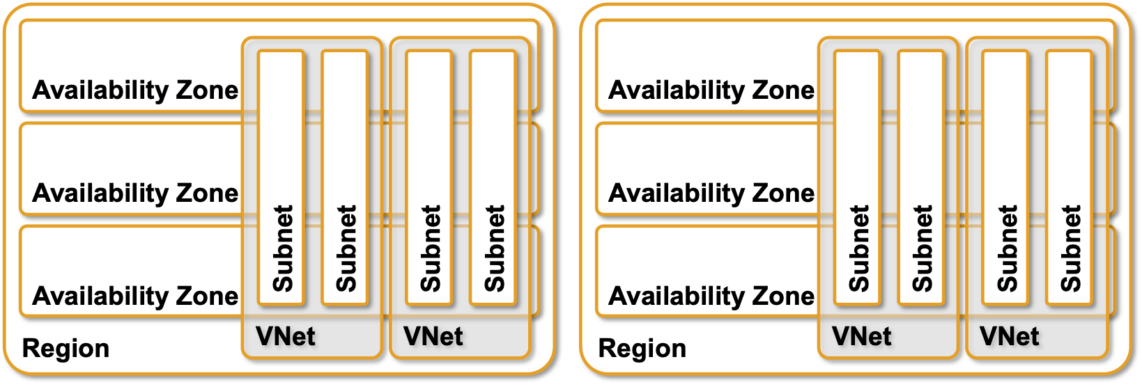 용어는 조금씩 다르지만, 리전, AZ, VPC, Subnet으로 나누어 보면, 서로 존재할 수 있는 위치가 조금 씩 다릅니다.