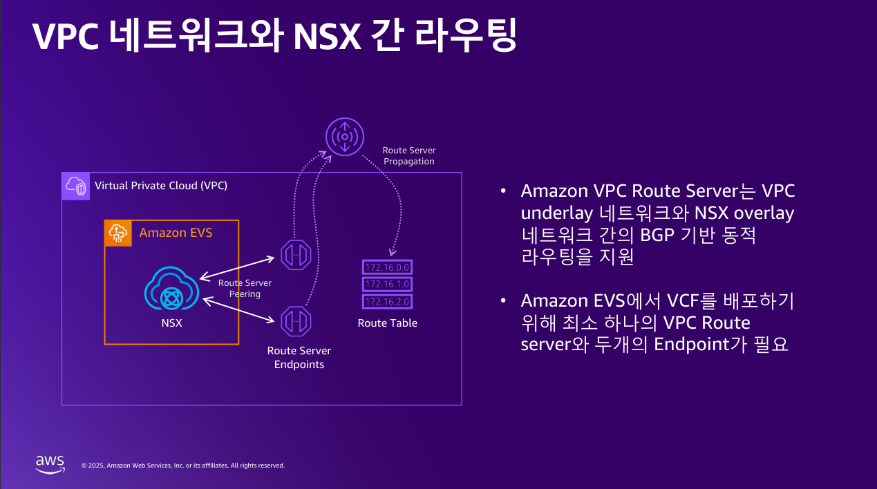 Amazon VPC route server를 통해서 VPC 네트워크와 VCF에 위치한 NSX 오버레이 네트워크 간의 라우팅 정보를 교환합니다.