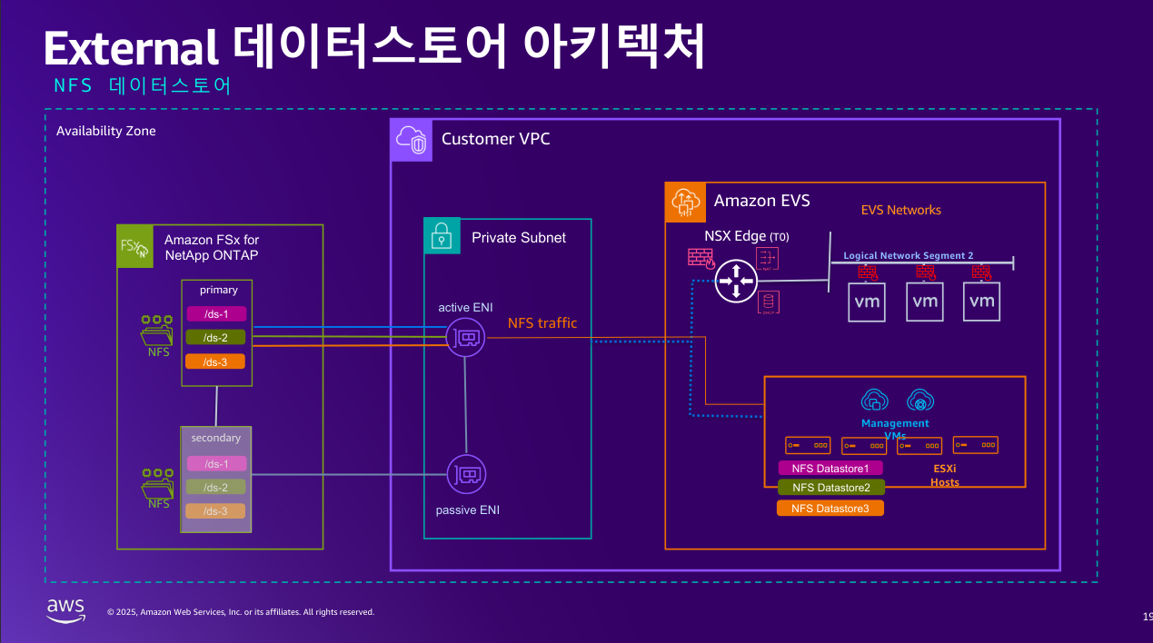 EVS 클러스터에 NFS 또는 iSCSI로 데이터스토어를 연결하고, VM 워크로드들을 통해 활용합니다.