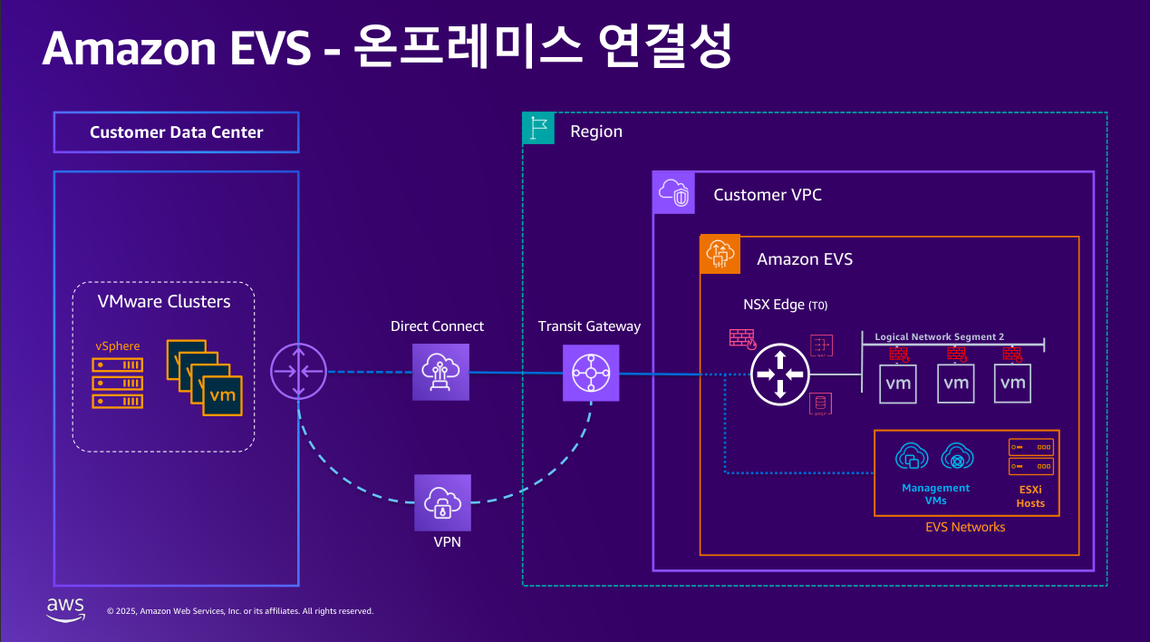 EVS는 일반적인 VPC 안에 구성이 되기 때문에 AWS의 네트워킹 기법을 이용해서 손쉽게 On-premises와 연결할 수 있습니다.