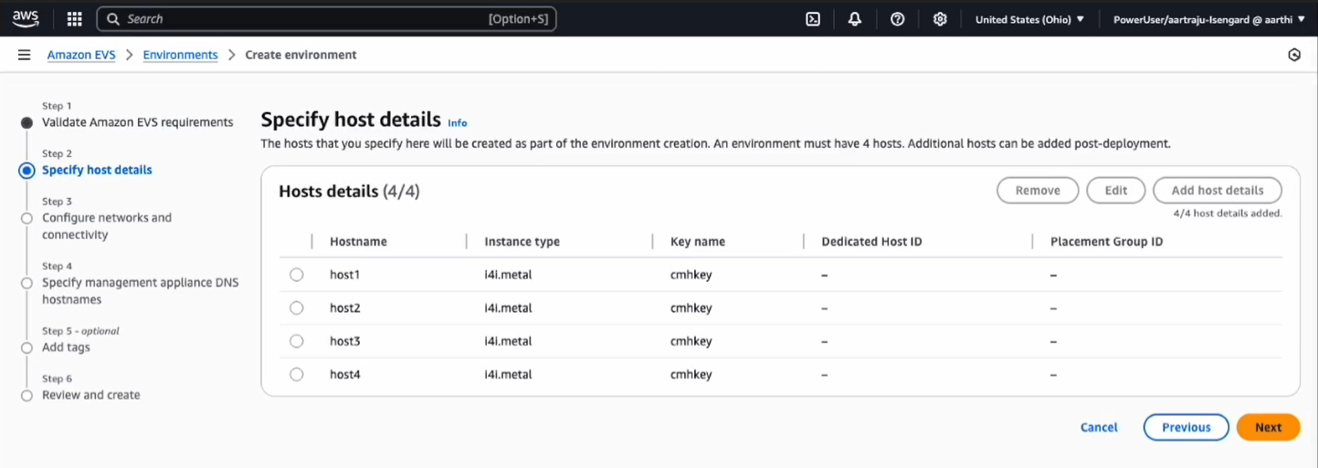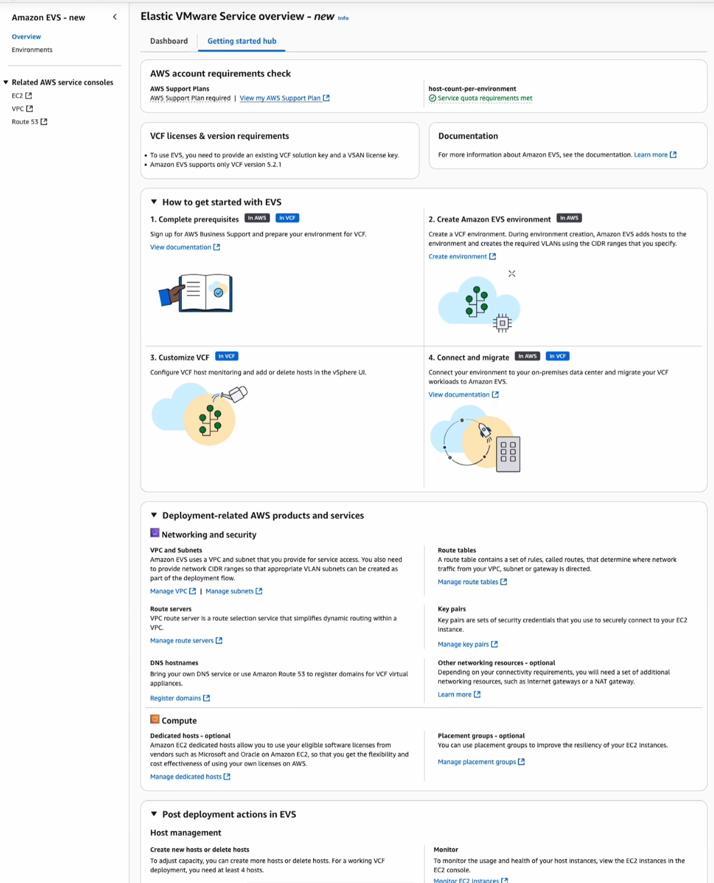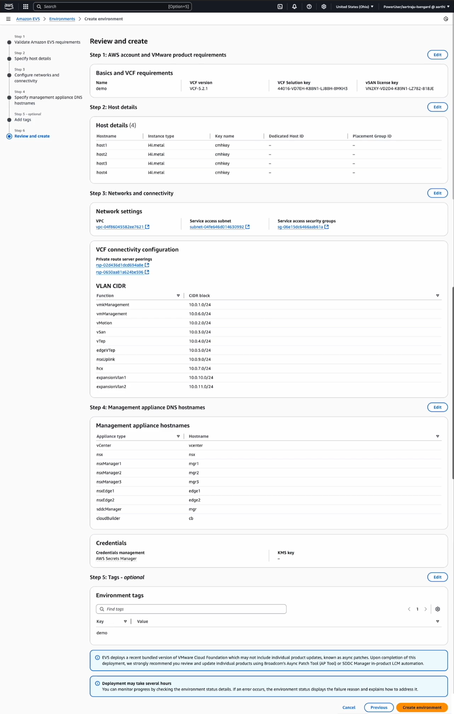 이제 본격적으로 AWS 콘솔을 통해 VCF 환경의 EVS를 배포하며, 전체 배포 과정은 약 3~4시간정도가 소요됩니다.