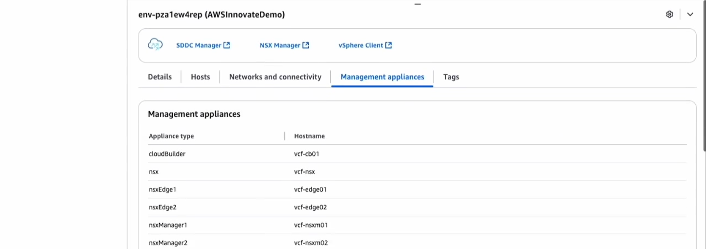 - Management appliance : 배포된 VCF 관련 관리용 VM들의 정보를 보여줍니다.