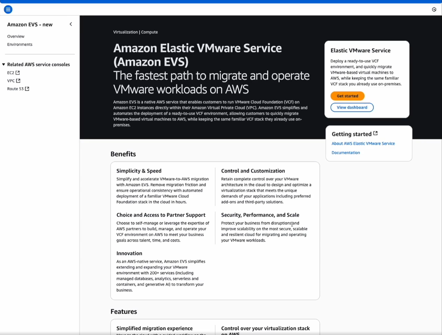 EVS를 배포하기 위해, 먼저 AWS 관리 콘솔에서 EVS 랜딩페이지에 접근하면 EVS 소개에 대한 시작화면을 만나게 됩니다.