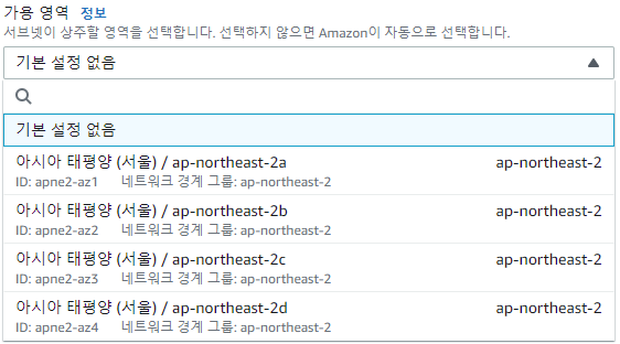 그럼 우리나라의 AZ 정보를 보면, 아래와 같이 4개의 AZ가 사용 가능하고,