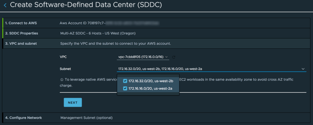 따라서 SDDC 최초 배포시 2개의 AZ에 위치한 'Connected VPC'를 선택해야 합니다.