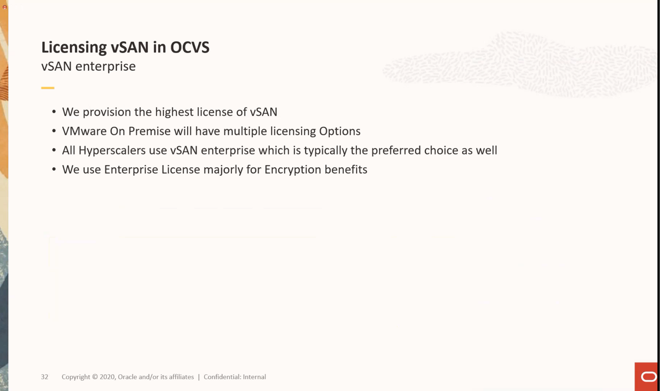 OCVS에 적용된 vSAN의 라이센스는 vSphere와 마찬가지로 가장 높은 등급의 라이센스입니다.