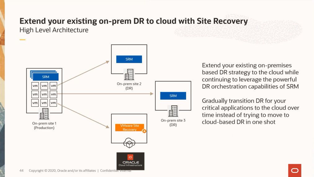이 경우 SRM의 강력한 DR 오케스트레이션 기능을 통해 기존 On-premise의 DR 전략을 클라우드로 확장할 수 있습니다.
