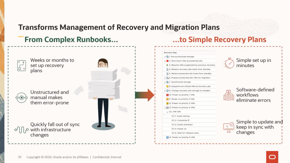 SRM을 이용하면 전체 복구 프로세스를 자동화할 수 있어, 기존 복구 단계의 많은 부분을 축소할 수 있습니다.