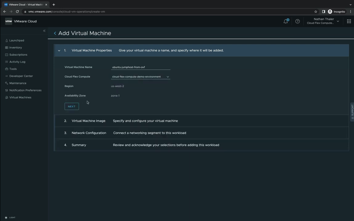 원하는 VM의 이름 및 Cloud Flex Compute 위치를 선택히고 'NEXT'를 선택 합니다.