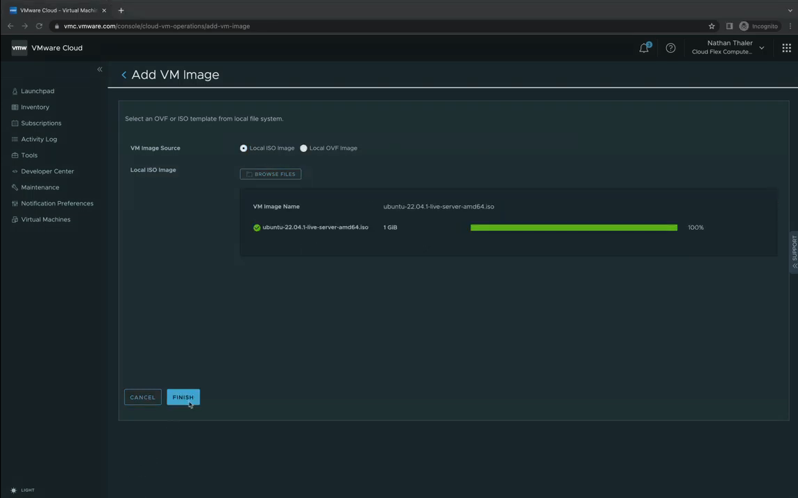 업로드가 완료되면 'FINISH'를 선택하여 VM images 메뉴로 돌아옵니다.
